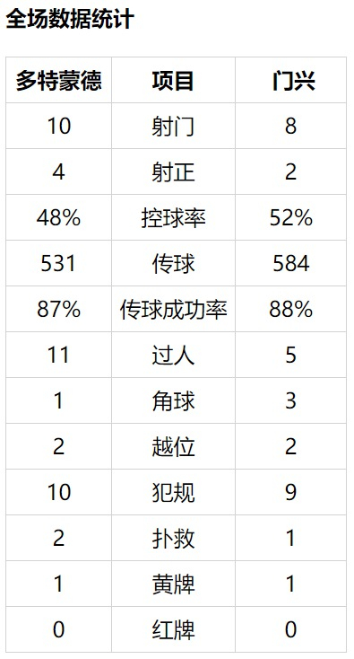 门兴(3-4-3):28-金特尔,30-埃尔韦迪,25-本-塞拜尼/18-莱纳,32-诺伊豪斯,6-克拉默,17-文特(69'赫尔曼)/11-沃尔夫(57'图拉姆),13-施廷德尔(57'普莱亚),23-霍夫曼