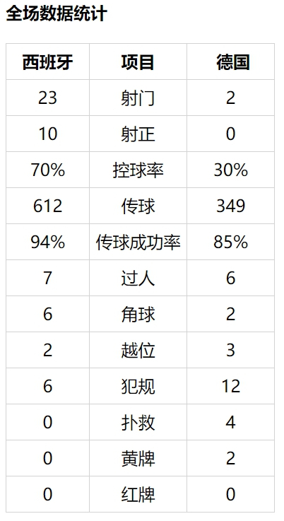 西班牙第89分钟锦上添花,罗德里挑传,加亚禁区左侧传中,奥亚萨瓦尔在门前6米处推射入网,6比0。诺伊尔职业生涯首次单场丢6+球。德国遭遇1931年0比6负于奥地利以来最惨失利。