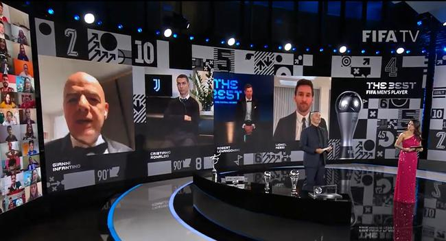 由于新冠疫情,国际足联年度颁奖首次采用线上虚拟形式。在颁奖典礼的压轴环节。国际足联主席因凡蒂诺和莱万、C罗、梅西通过视频连线。因凡蒂诺宣布莱万当选。