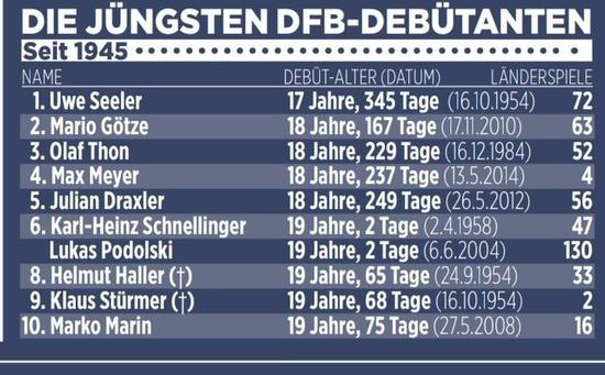 在1945年后为德国国家队上演首秀最年轻球员排行榜前十的球员还有:奥拉夫-托恩(18岁零229天)、马克斯-迈尔(18岁零237天)、德拉克斯勒(18岁零249天)、施内林格(19岁零2天)、波多尔斯基(19岁零2天)、赫尔穆特-哈勒(19岁零65天)、克拉乌斯-斯特姆(19岁零68天)、马林(19岁零75天)。