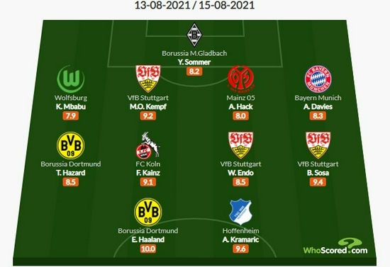 直播吧8月16日讯 新赛季德甲首轮比赛目前已经结束了全部的争夺,本轮德甲比赛,拜仁和门兴战成了1-1的平手,多特则以5-2的比分大胜法兰克福。欧洲著名数据网站《Whoscored》评选出了本轮德甲比赛最佳阵,哈兰德、小阿扎尔领衔,阿方索-戴维斯在列。