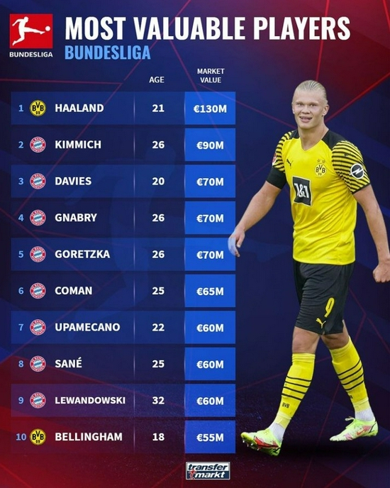 德甲身价榜:前10拜仁占8位 哈兰德1.3亿欧领跑