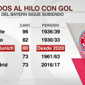 拜仁连续80场进球排世界第3 距离第2仅差2场