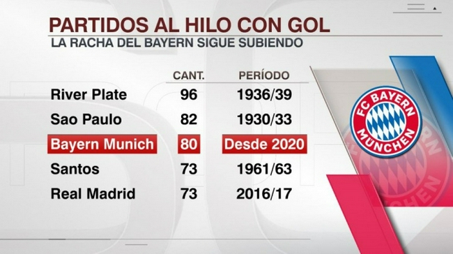 连续进球的纪录排在前2位的还要追溯到上世纪的30年代。河床以96场排名第一位,圣保罗以82场排名第2位,拜仁目前距离圣保罗只有2场的差距。