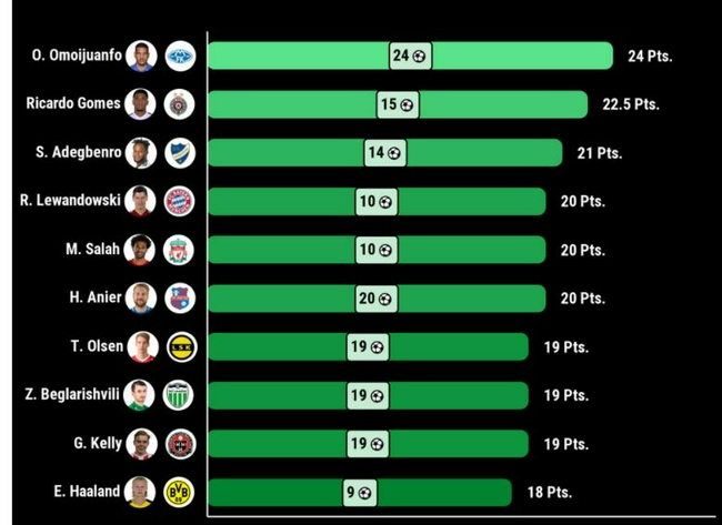 目前排名第一的是挪威莫尔德队的奥莫伊胡安弗,他上场22次打入24球,然而1个进球只值1分,积24分。