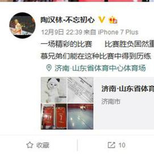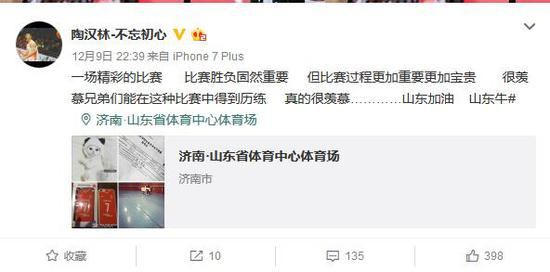 在看了昨晚这场精彩的比赛后,陶汉林在微博上这样写到:一场精彩的比赛,比赛胜负固然重要,但比赛过程更加重要更加宝贵,很羡慕兄弟们能在这种比赛中得到历练,真的很羡慕......山东加油,山东牛。