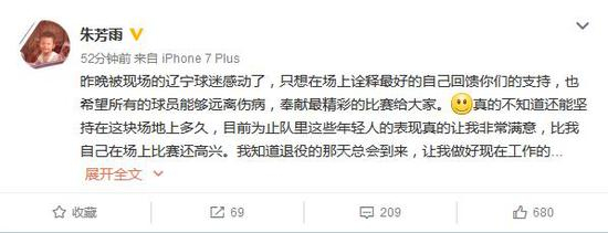 “昨晚被现场的辽宁球迷感动了,只想在场上诠释最好的自己回馈你们的支持,也希望所有的球员能够远离伤病,奉献最精彩的比赛给大家。”朱芳雨在自己的微博里写道。