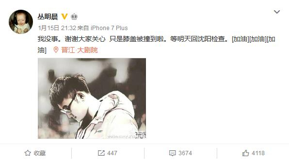 丛明晨是在1月15日辽宁与福建的受伤的,当时他曾以为自己受伤的情况不严重,赛后还曾发微博称“我没事。谢谢大家关心,只是膝盖被撞到啦。等明天回沈阳检查。”