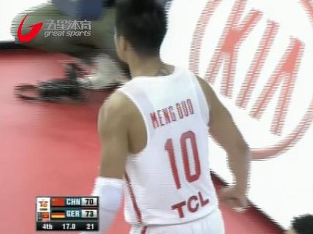 末节争夺,阿格瓦篮下勾手命中,回来赵继伟直塞空切的范子铭上篮得手,尤格来外线空位3分稳稳命中,王哲林篮下强打也中,双方进攻你来我往。孟铎先是急停跳投稳稳命中,接着快攻中暴扣得分。奥布斯特外线3分命中,双方战成65-65平。孟铎外线3分命中,里奇特补篮也有。德国队抢断反击中造成中国队犯规,德国队手握3分优势,孟铎抢断反击打中并造成加罚。最后时刻中国队落后一分,采取犯规战术,最终全场比赛结束,德国队76-73战胜中国队。