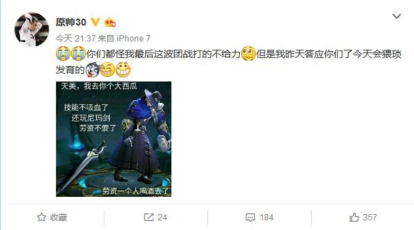 面对球迷们善意的玩笑,原帅本人也很大度的发了一个微博,用游戏里的话来回应大家“们都怪我最后这波团战打的不给力,但是我昨天答应你们了今天会猥琐发育的。”