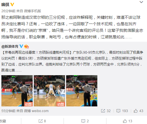 联系到本轮山西与新疆的比赛,最后时刻同样出现了裁判漏判界外球的情况,一时间网友对于CBA裁判执法水平和北京队从判罚中获利的质疑声四起。对此,北京电视台体育频道的主持人魏祺站出来为北京队“撑腰”。魏祺并没有直接否认方硕接球时踩线出界,而是表示职业联赛中裁判在吹罚时“找平衡”很正常,任何球队都有吃亏的时候,也有占便宜的时候。并且暗示在方硕这个球之前,汉密尔顿防守易建联投篮时被吹了三次罚球有点冤。