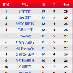 北京时间12月15日消息,CBA第16轮比赛全部结束,辽宁队13胜3负位列第一,山东同为13胜3负战绩,排名第二,广厦第三,江苏肯帝亚第四,北京队排名第五,广东第六,深圳第7,新疆队排名第八位,浙江和广州分列第九和第十。