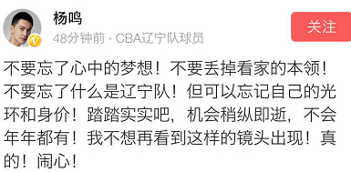 杨鸣写道:“不要忘了心中的梦想!不要跌掉看家本领!不要忘了什么是辽宁队!但可以忘记自己的光环和身价!踏踏实实吧,机会稍纵即逝,不会年年都有!我不想再看到这样的镜头出现!真的!闹心!”