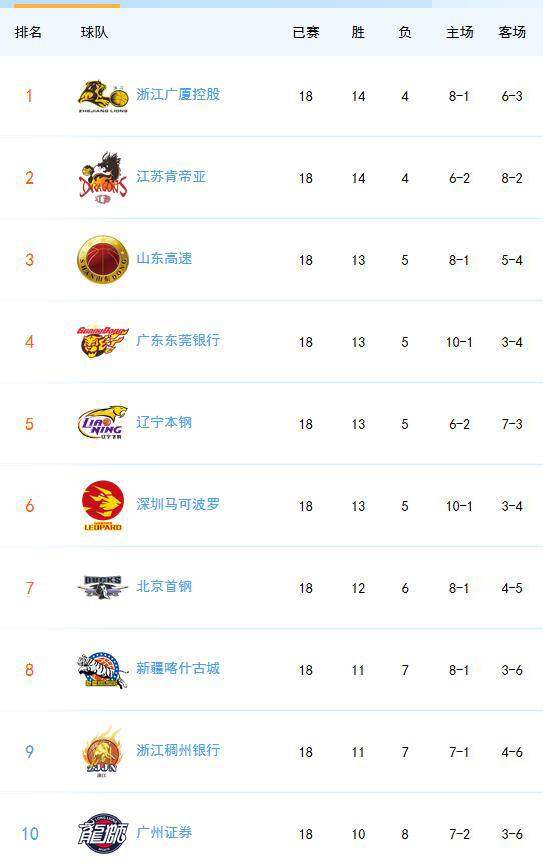 北京时间12月21日消息,18轮联赛打完之后,CBA积分榜的竞争仍然非常激烈,浙江广厦与江苏肯帝亚以14胜4负的成绩并列前两位,排在3-6位的山东、广东、辽宁、深圳这四支球队的战绩是13胜5负,北京、新疆、浙江、广州分列7-10位。