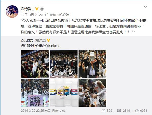 在本场比赛后,高诗岩转发了自己2016年看到四川队夺冠时刻的一条微博,转发语中这样写到:“今天我终于可以翻出这条微博!从菜鸟赛季看着球队总决赛失利却不能帮忙干着急,这种感觉一直激励着我!可能只是普通的一场比赛,但是对我来说有着不一样的意义!虽然我有很多不足!但是这场比赛我拼尽全力也要胜利!!!”