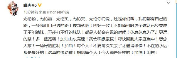 “无论输,无论赢,无论笑,无论哭,无论你们说,还是你们叫,我们都有自己的路,一条我们自己选的路!按部就班!团结一致!不知道何时这个球队已经变成了不能输球,不能打不好的球队!都是人都会有累的时候!休息休息为了走更远的路!多一些宽容!加油山东高速!我会积极康复!尽快回到大家庭当中!想念大家!一场好的胜利!加油!每个人!不要每次失去了才懂得珍惜!不在的永远都是最好的!这真的很幼稚!相信每个人!今天都是好样的!加油!山东!”