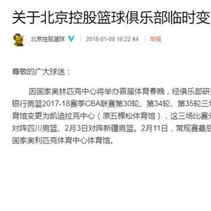 “因国家奥林匹克中心将举办首届体育春晚,经俱乐部研究决定,北控男篮本赛季CBA联赛第30轮、第34轮、第35轮三场赛事主场由国家奥林匹克体育中心体育馆变更为五棵松体育馆,这三场比赛分别为1月24日对阵辽宁男篮、2月1日对阵四川男篮、2月3日对阵新疆男篮。2月11日,常规赛最后一场主场对阵江苏肯帝亚的比赛将重回国家奥利匹克体育中心体育馆。”