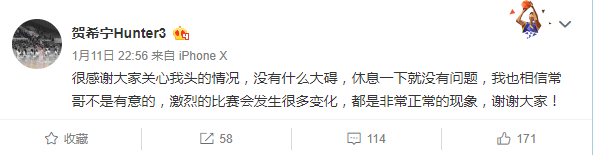 贺希宁写道:“很感谢大家关心我头的情况,没有什么大碍,休息一下就没有问题,我也相信常哥不是有意的,激烈的比赛会发生很多变化,都是非常正常的现象,谢谢大家!”