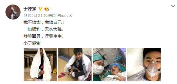 “我不信命,我信自己!一切顺利,无伤大雅。静等面具,涅槃重生。小于感谢!”于德豪在微博上写道,他还同时晒出多张照片,包括在手术室与护士合影,这些照片中无一例外于德豪都展露出阳光灿烂的笑容,由此可见他的心态还是非常乐观的。
