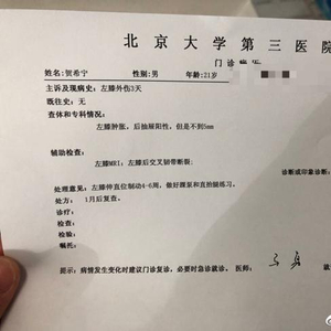 在2月3日北控与新疆队的比赛后,贺希宁就前往医院对伤势进行检查,今天贺希宁在微博上贴出了医院的诊断书,核磁共振的结果是:左膝后交叉韧带断裂。此外,贺希宁还晒出了一张自己的照片,从中可以看到他的左腿已经带伤护具进行了固定。
