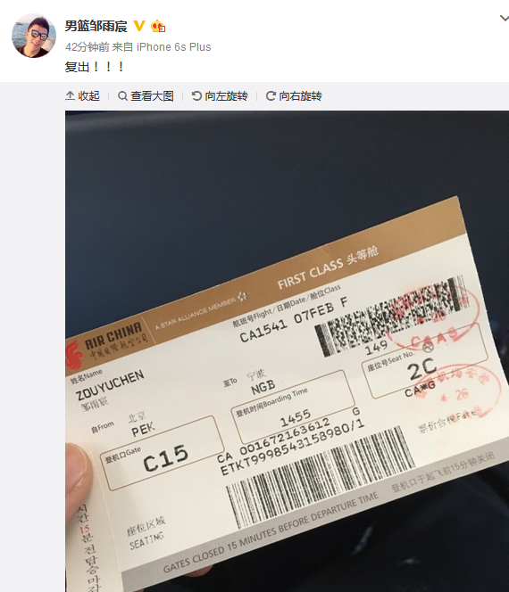 北京时间2月7日,2017-18赛季CBA常规赛第36轮今晚继续进行,八一将在主场对阵北控。八一内线大将邹雨宸今日晒出飞回宁波的机票,同时表示自己即将复出。