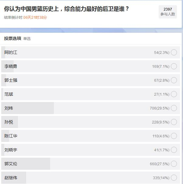 在接近2400名网友的投票中,刘炜获得了706票,得票率29.5%,高居第一位。排名第二的是郭艾伦的660票(27.5%);排名第三的是赵继伟335票(14%);孙悦排名第四位,他得到228票(9.5%);排名第五位的是辽宁队的名宿李晓勇,他得到169票(7.1%)。