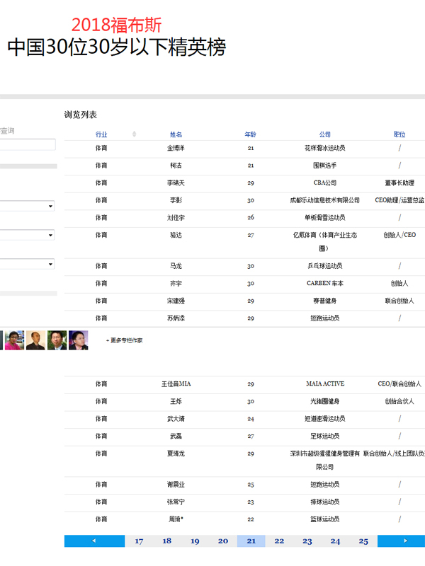 2018年8月2日,福布斯中国正式公布2018年中国“30位30岁以下精英”榜单(简称福布斯中国30 Under 30)。本榜单首次涵盖了20个不同领域各30位30岁以下精英,共有600位青年才俊入选。