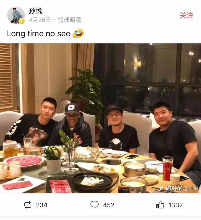 时间倒回到4个月前,4月26日,孙悦在社交媒体上发布了一张照片,照片里,他和马布里还有朋友在一起吃饭,桌上有酒有肉,像是一家人在一起团聚的样子。