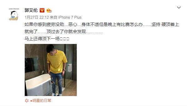 “如果你感到疲劳没劲、恶心,身体不适但是晚上有比赛怎么办,坚持!硬顶着上就完了。顶过去了你就会发现,马上还得顶下一场”比赛时结束后,郭艾伦在微博上这样写道。