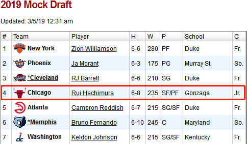 在这份2019年的模拟选秀榜单中,排在第一位的是大名鼎鼎的锡安-威廉姆森,排在第二位的是贾-莫兰特,排在第三位的是R.J.-巴雷特,排在第四位的是八村塁,排在第五位的是卡梅罗-雷迪什。作为一名冈萨加大学的大三学生,年满21岁的八村塁能够高居第四着实不易,但也足见他有多么出色。