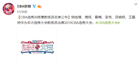 柳继增、傅扬、霍楠、李克、吕晓明、王磊将作为本次选秀大会教练员出席2019CBA选秀大会。