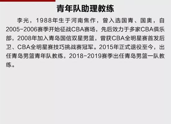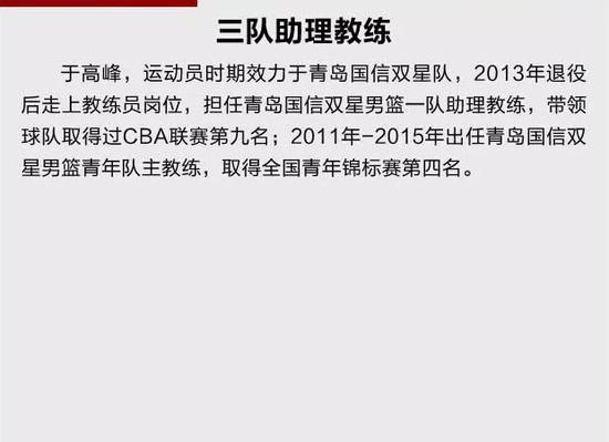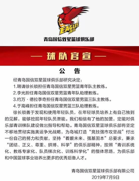 北京时间7月9日,青岛男篮官方宣布,山东名宿徐长锁将担任青岛男篮二队主教练,前CBA球员李光担任二队助理教练。塞尔维亚人约万-德拉季奇担任三队主帅,前CBA球员于高峰担任三队助理教练。