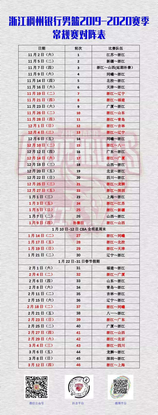 浙江队赛程:5连客艰苦开局 新年收官两战宿敌
