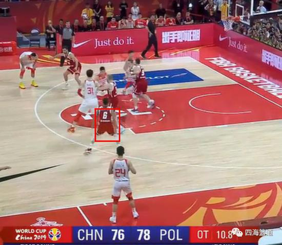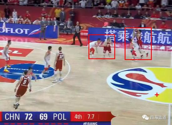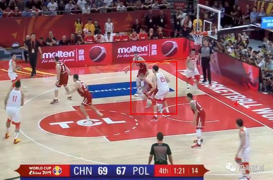 波兰队就是用了这个防守的变化成功的防住了我们的这个进攻,那就是防背掩护的人换防持球的人。