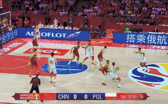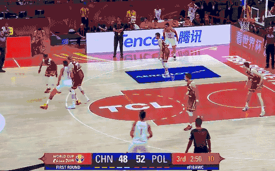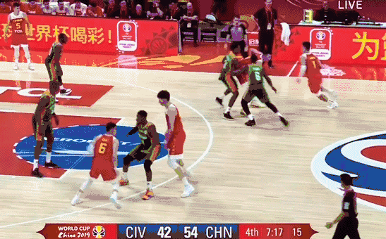 中国队高位双挡拆,对方换人,小个子防守周琦。周琦应该篮下要位进攻,但是他只是象征性的要了一下放弃了进攻。