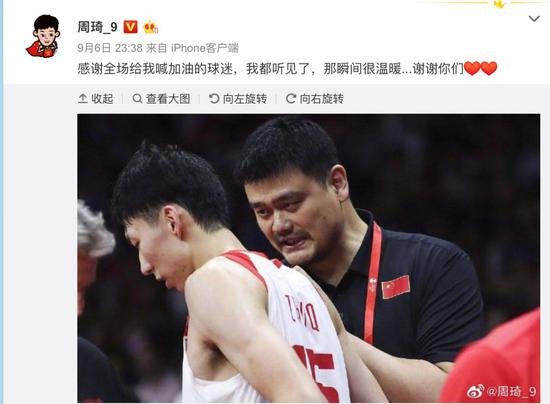 战胜韩国赛后,周琦继波兰一役后,首次更新了微博,感谢现场球迷的鼓励。