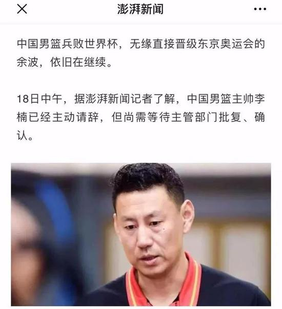 时间9月18日,根据澎湃新闻记者报道,中国男篮主教练李楠已经主动请辞,尚需等待主管部门审核、批复。但随后澎湃新闻下线了李楠请辞的相关报道。
