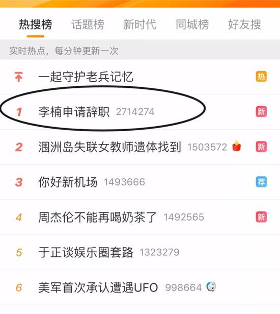 该消息曝出后不久,“李楠申请辞职”就立刻空降微博热搜榜第一名。即使是真的,也只是李楠主动请辞,不代表他已经正式离任。