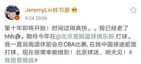 当然,最后林书豪表达了期待——期待今年在首钢篮球俱乐部打球!我一直说我在退休前会在CBA比赛,在我的中国球迷面前打球,现在很荣幸能做到!球迷,明天见!
