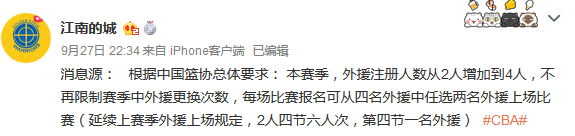 来自微博消息人士透露,新赛季CBA在外援使用上会有变化:根据中国篮协总体要求: 本赛季,外援注册人数从2人增加到4人,不再限制赛季中外援更换次数,每场比赛报名可从四名外援中任选两名外援上场比赛(延续上赛季外援上场规定,2人四节六人次,第四节一名外援)