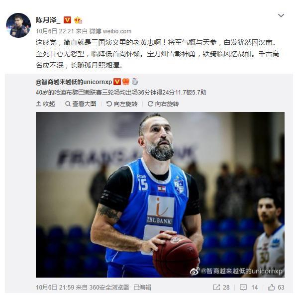 对于哈提布的恐怖表现,著名篮球记者陈月泽十分感慨,“这感觉,简直就是三国演义里的老黄忠啊!将军气概与天参,白发犹然困汉南。至死甘心无怨望,临降低首尚怀惭。宝刀灿雪彰神勇,铁骑临风忆战酣。千古高名应不泯,长随孤月照湘潭。”