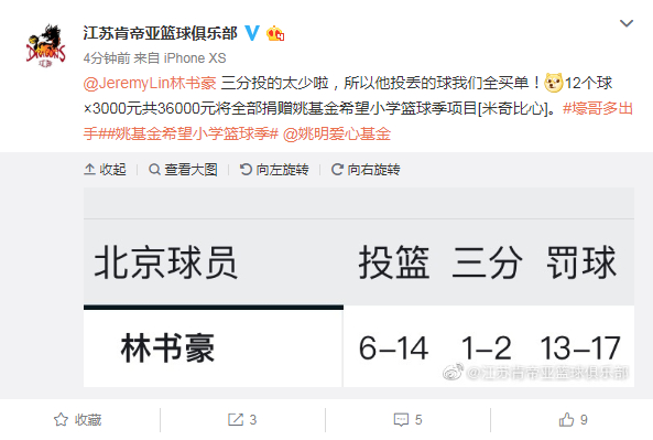 然而,比赛之后,肯帝亚再次通过微博发出消息,官方“吐槽”林书豪三分投得太少了,并表示“他投丢的球我们全买单!12个球×3000元共36000元将全部捐赠姚基金希望小学篮球季项目。”