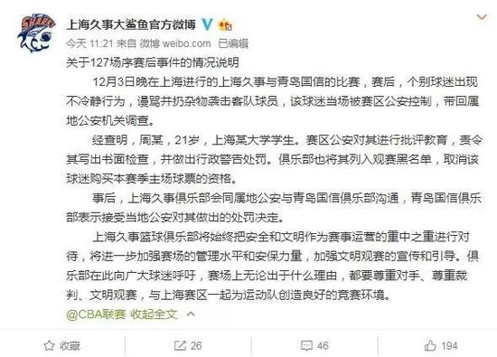 上海男篮这一举措也对部分偏激的球迷