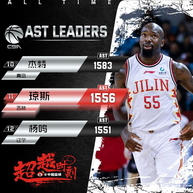 助攻各方面,琼斯生涯总助攻数来到1556次,超越辽宁名宿杨鸣(1551次),升至CBA历史总助攻榜第11位。
