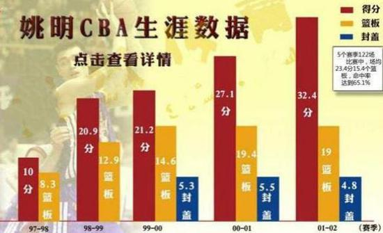 姚明在CBA一共打了5个赛季,从最早场均10分8.3篮板,到最后一年的场均32.4分19篮板4.8盖帽。总决赛更是创造了21投全中神迹,由于在CBA太亮眼,姚明这才在2002年以状元身份加盟NBA。