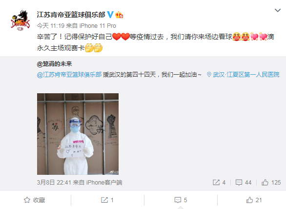 3月8日,一位援助武汉44天的女医生微博艾特了肯帝亚男篮官方,表示了自己的铁粉身份。