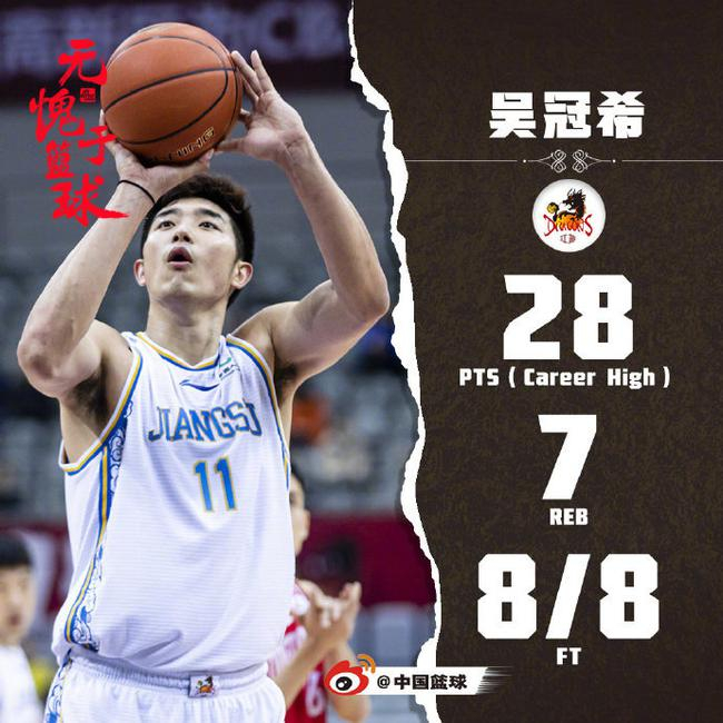 2019年11月21日,江苏男篮在主场迎来本赛季可谓黑马的青岛男篮。吴冠希不仅包办本队的前12分,而且全场比赛更是砍下个人职业生涯单场最高的28分。也正是在吴冠希的带领下,江苏男篮主场130比114大胜青岛男篮,这场胜利也成为江苏男篮本赛季值得回味的胜利之一。