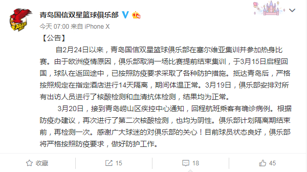 自2月24日以来,青岛国信双星篮球俱乐部在塞尔维亚集训并参加热身比赛。由于欧洲疫情原因,俱乐部取消一场比赛提前结束集训,于3月15日启程回国,球队在返回途中,已按照防疫要求采取了各种防护措施。抵达青岛后,严格按照规定在指定酒店进行14天隔离,期间体温正常。3月19日,俱乐部安排对所有出访人员进行了核酸检测和血清抗体检测,结果均为正常。