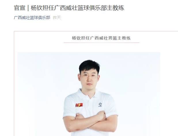 NBL广西威壮篮球俱乐部官方宣布, 杨钦担任广西威壮男篮主教练。杨钦是CBA冠军教练杨学增之子。