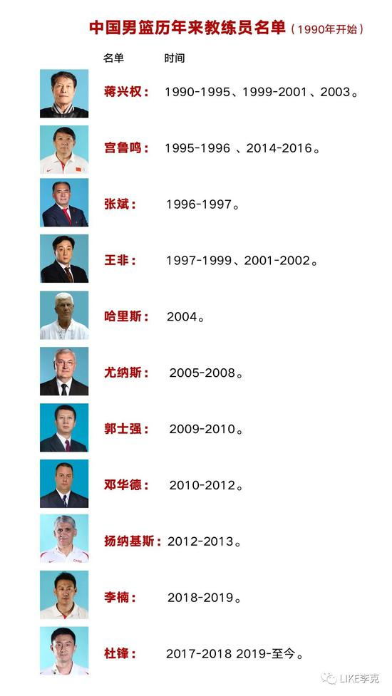 其实近20多年的中国男篮主教练位置更换的很快,从96年开始到现在,蒋兴权、宫鲁鸣、张斌、王非、扬纳基斯、尤纳斯、哈里斯、郭士强、邓华德,再到李楠,杜锋。